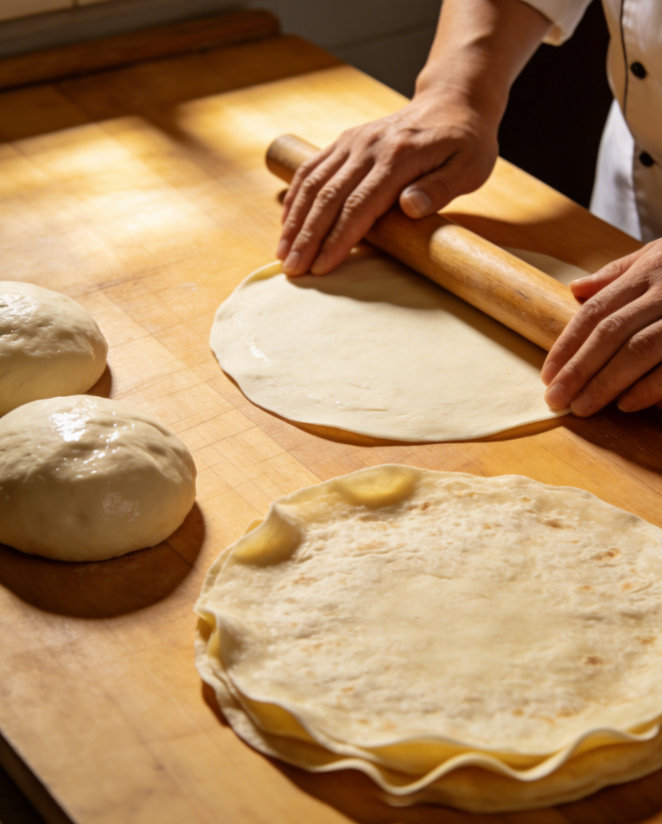 - 干面粉宁少勿多:擀面时只撒薄薄一层防粘就行,多了烙馍发干,卷菜的时候容易碎,还会影响麦香。